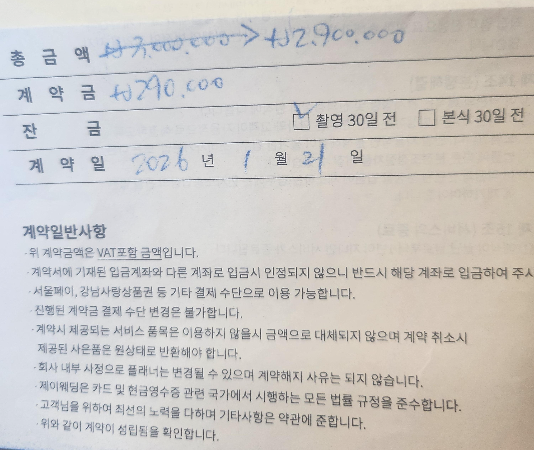 - 추가 비용 발생 항목: 스튜디오 촬영 헬퍼 ,드레스 피팅비용, 메이크업 직급에 따른 추가금